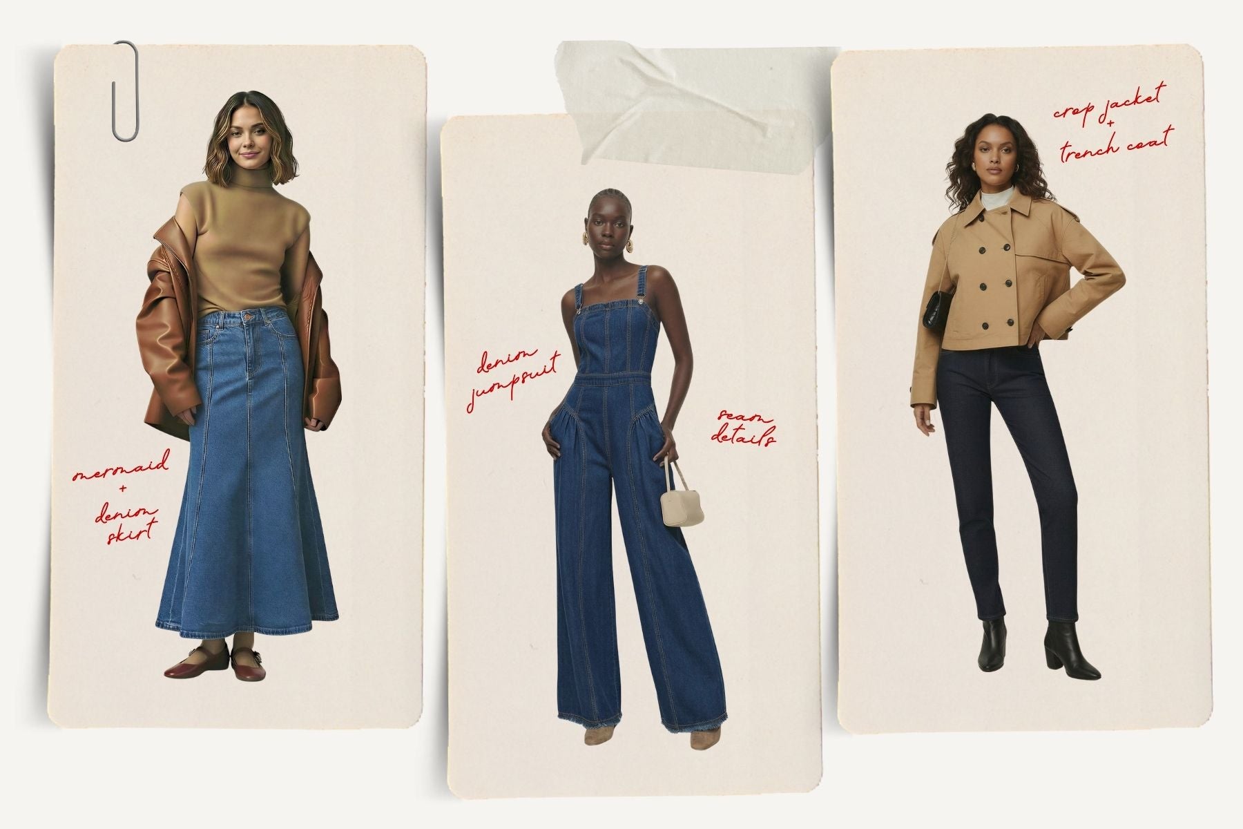 Mermaid denim skirts bring a fresh shape to a classic fabric, balancing structure with movement. Denim jumpsuits offer an effortless one-and-done look, elevated by seam detailing and flattering proportions.
