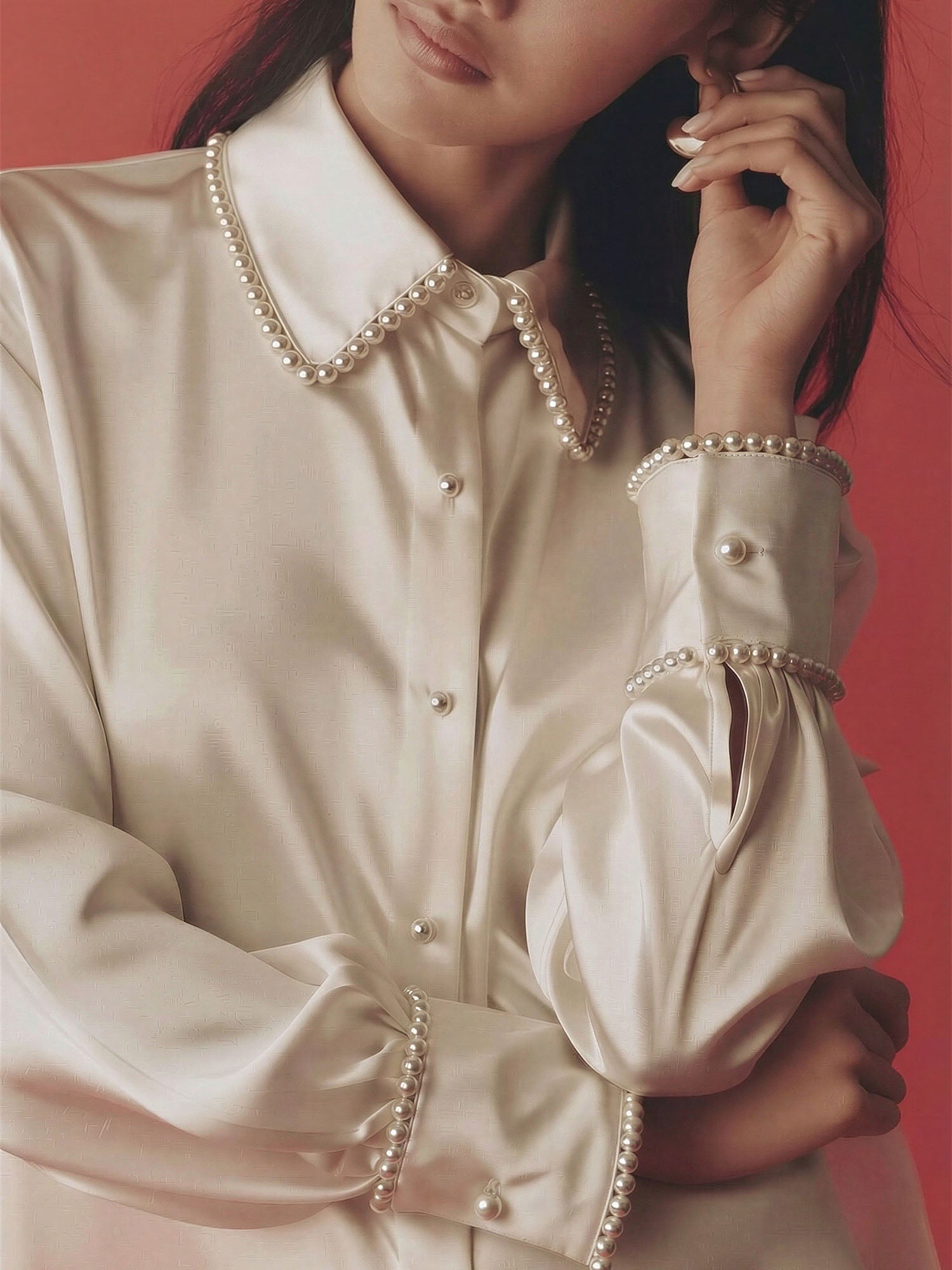 Satin Pearl Trim Button Down Shirt