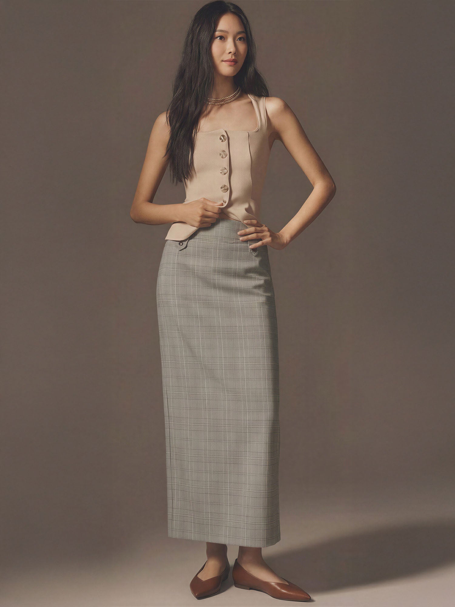 Two Pocket Plaid Maxi Pencil Skirt