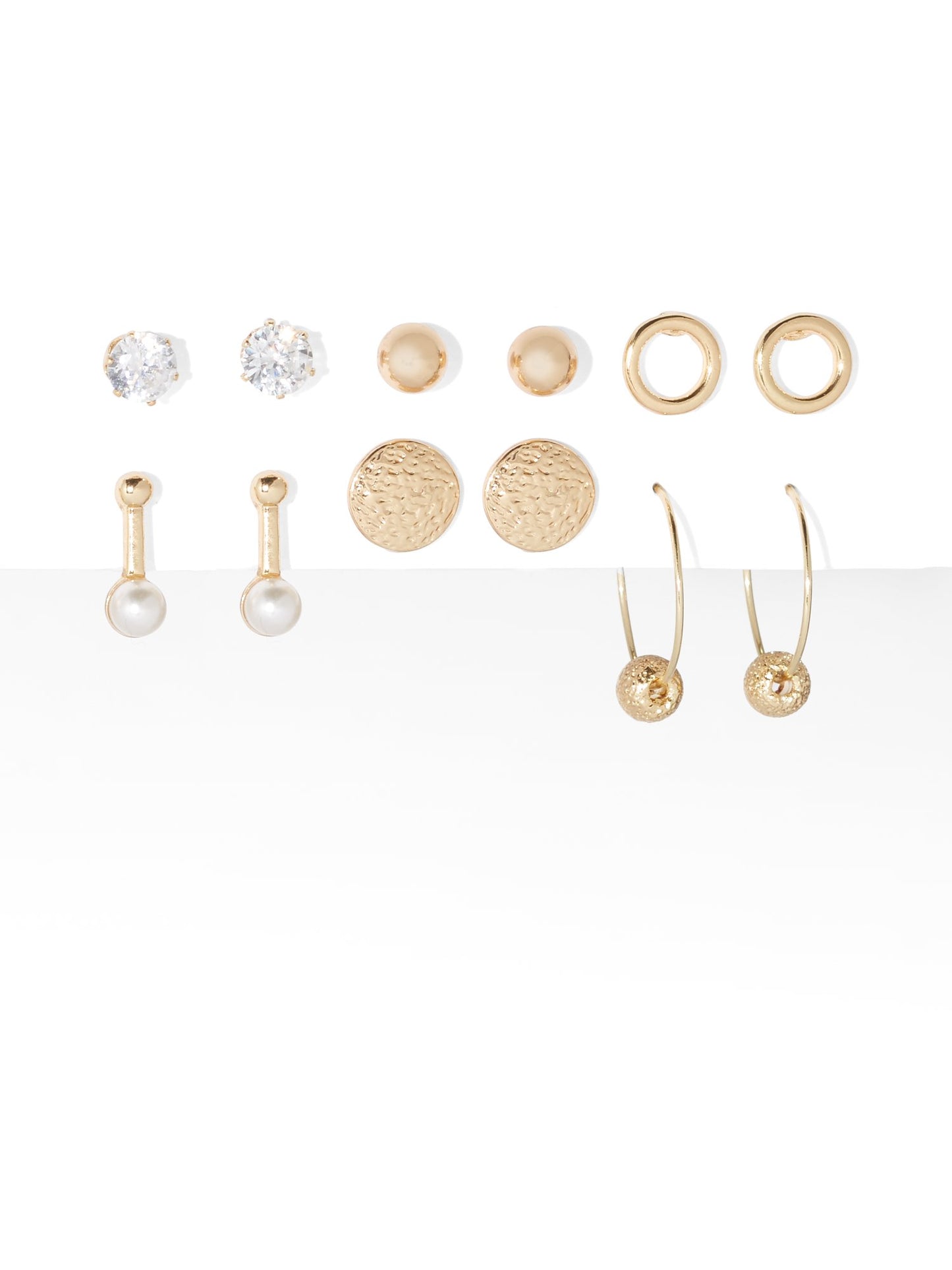 Hoop, drop and post styles add versatility to our polished goldtone earrings set, adorned with glittering faux stones and lustrous faux pearls.