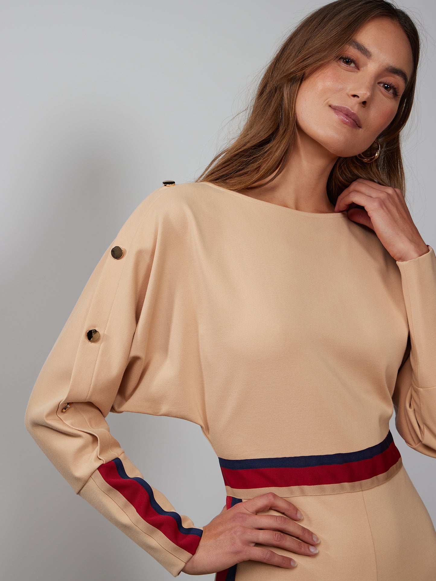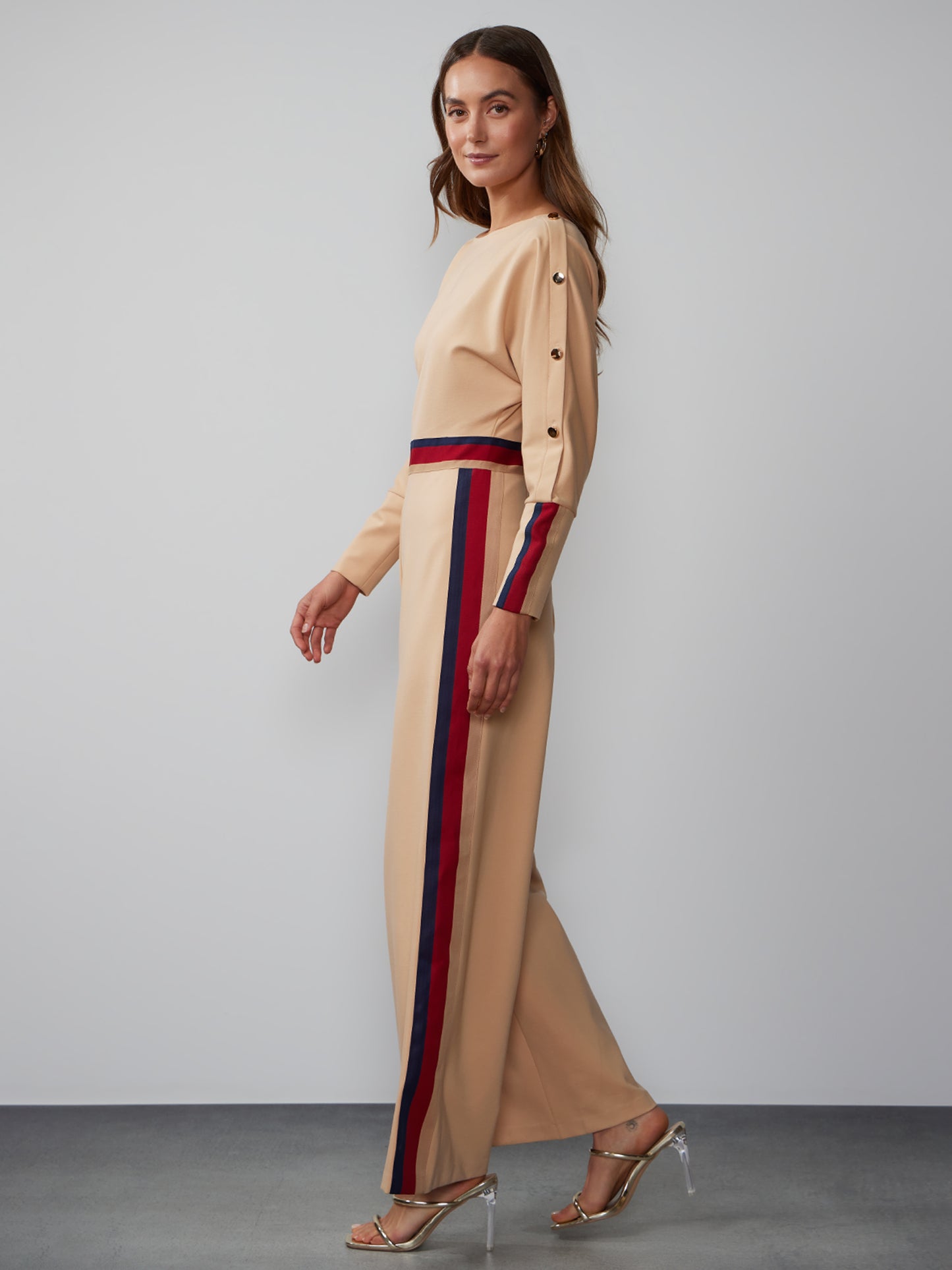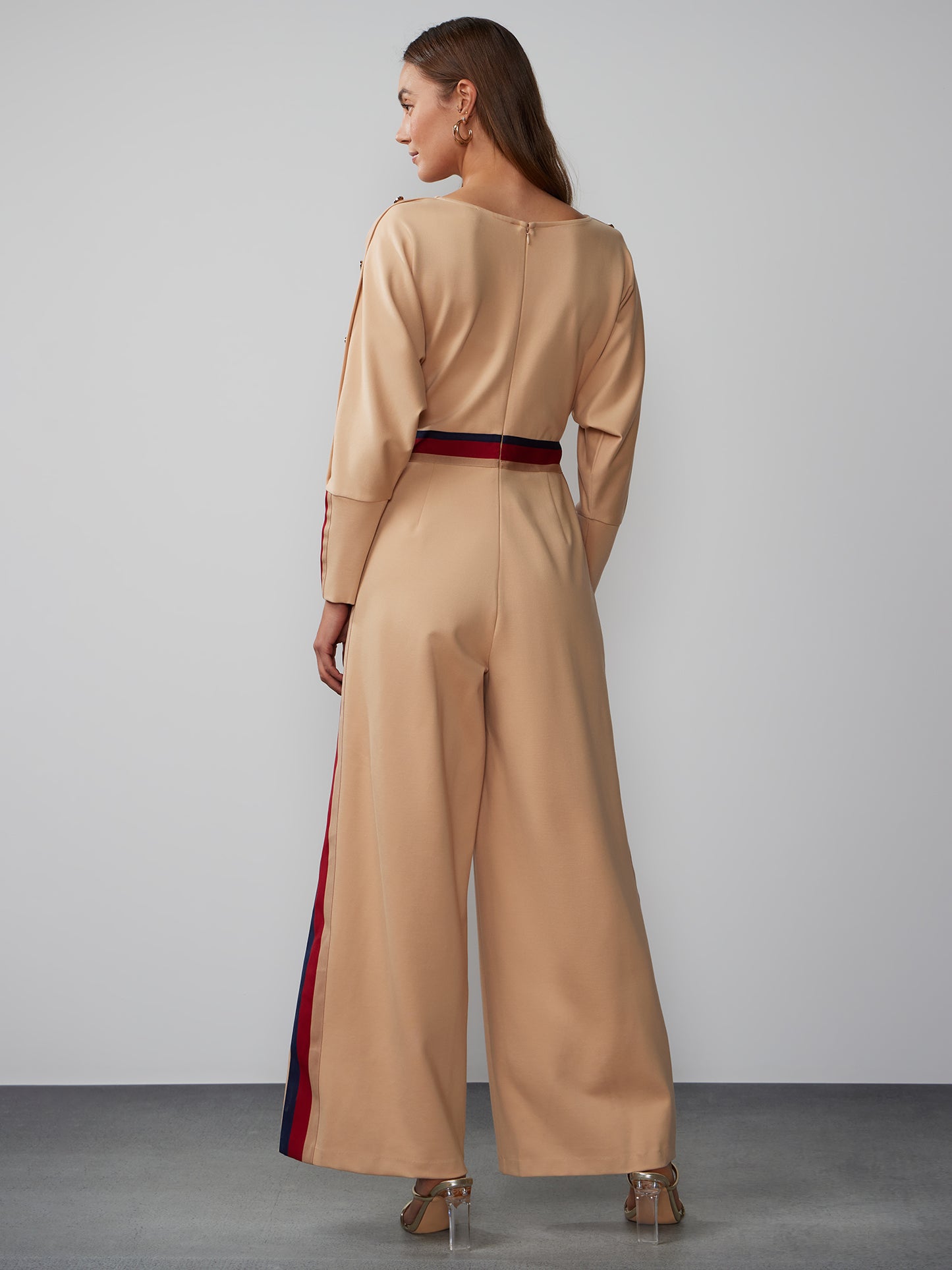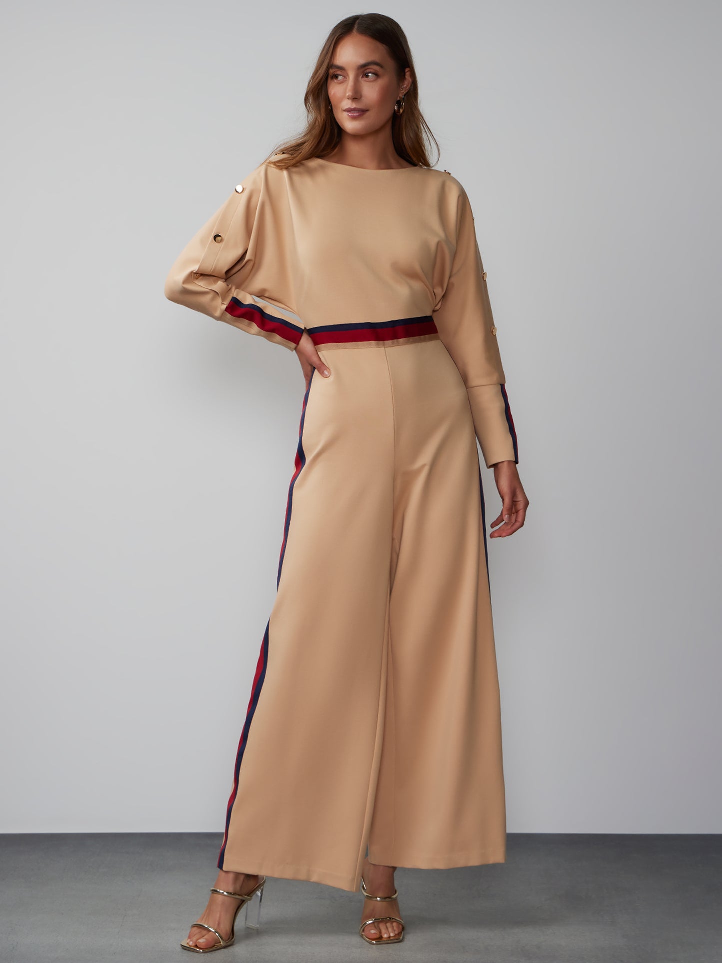 Discover effortless style in this chic and classy jumpsuit, a must-have addition to your collection of jumpsuits for women. Crafted with meticulous attention to detail, this jumpsuit features striking Dolman sleeves and trendy side stripes to add a contemporary flair, while the delicate button detailing on the sleeves exudes timeless elegance.