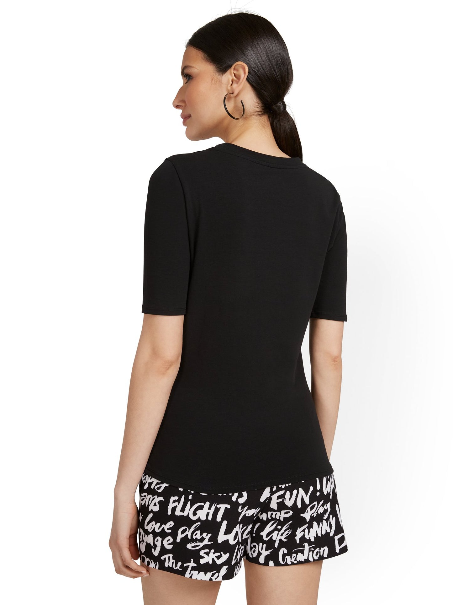 In our comfy City Knit Cotton, this elbow-sleeve tee has an asymmetrical cutout above the bustline for a sexy-meets-professional look.