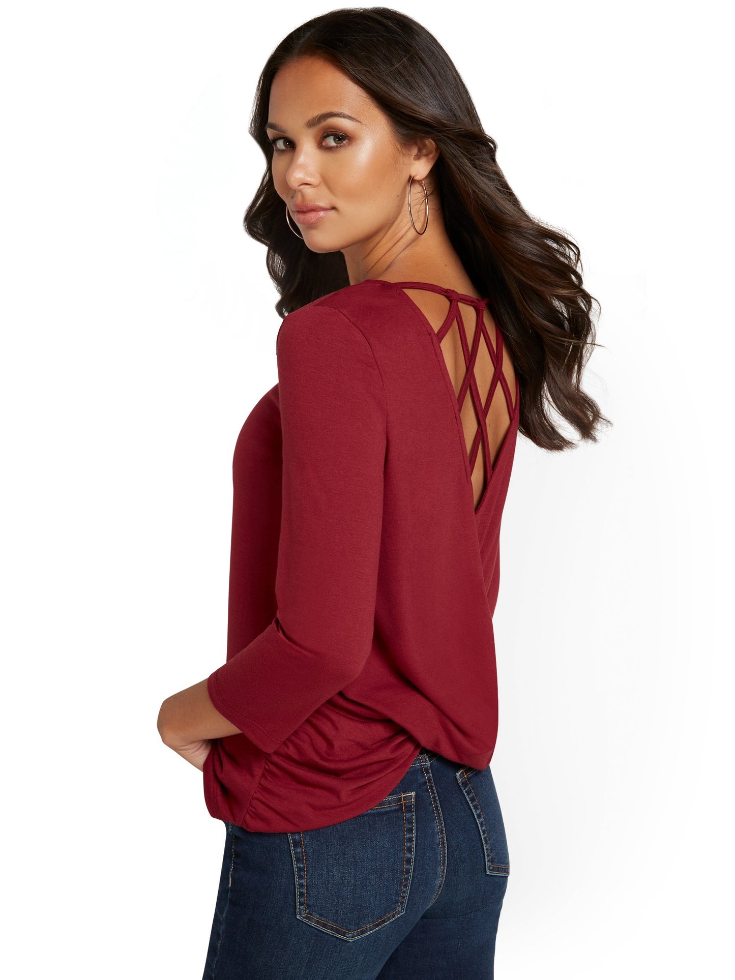 With a open, lattice design at the back and criss-cross hem, this tunic top is an elevated addition to any wardrobe.