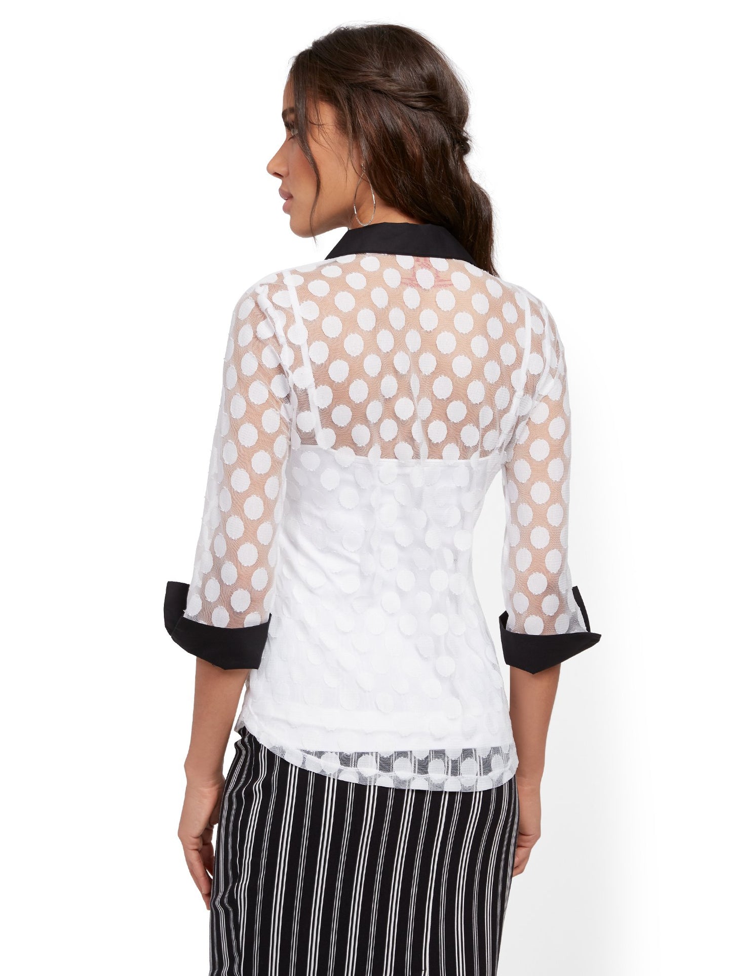 All-over polka dots add an on-trend twist to our lightweight, airy mesh top, accented by polished buttons. Pairs perfectly with our camisole tops.