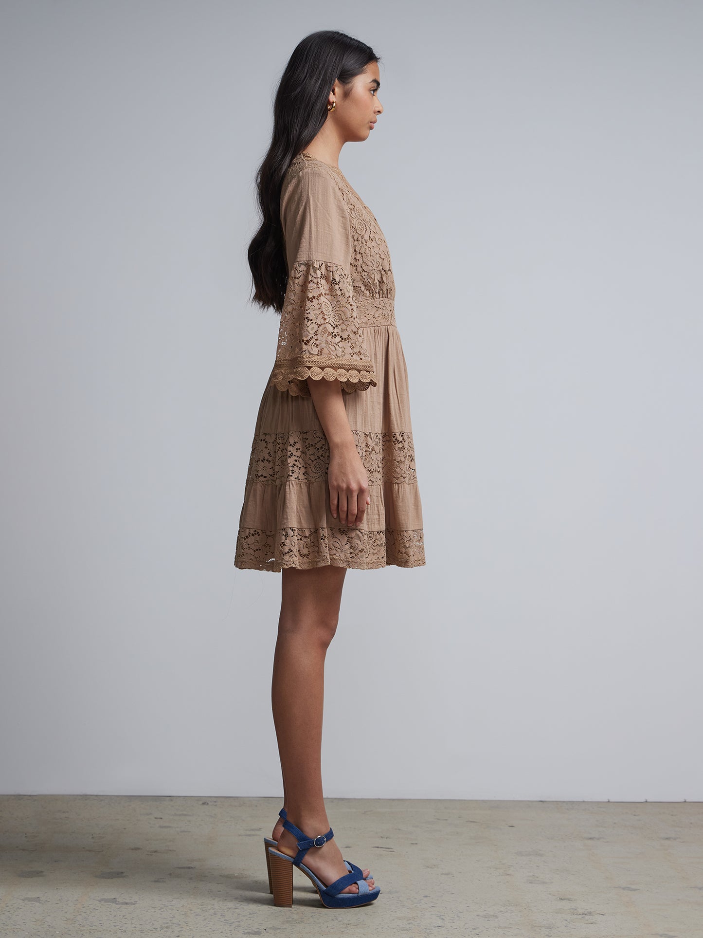 A classic dress with retro detailing, this piece is perfect for spring. It features bell-sleeves and a flare silhouette, with lace trim throughout.