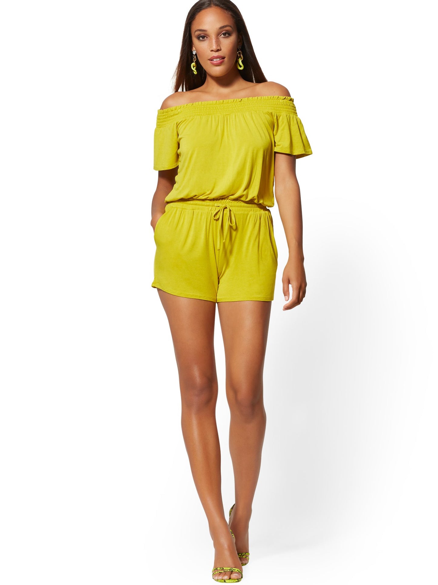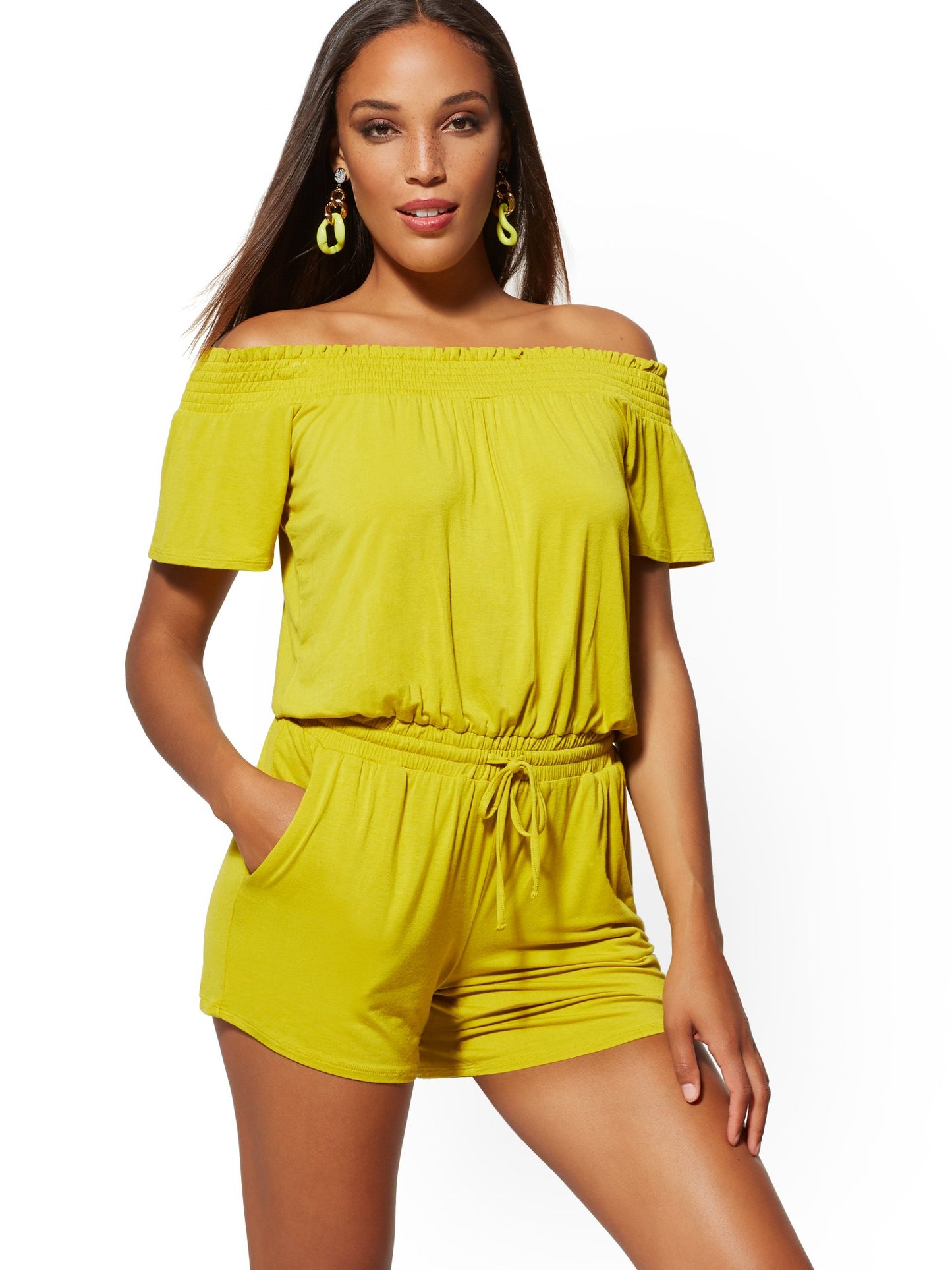 A drawstring-tie closure adds a sporty twist to our off-the-shoulder romper, finished with smocked embellishment and flounced sleeves.