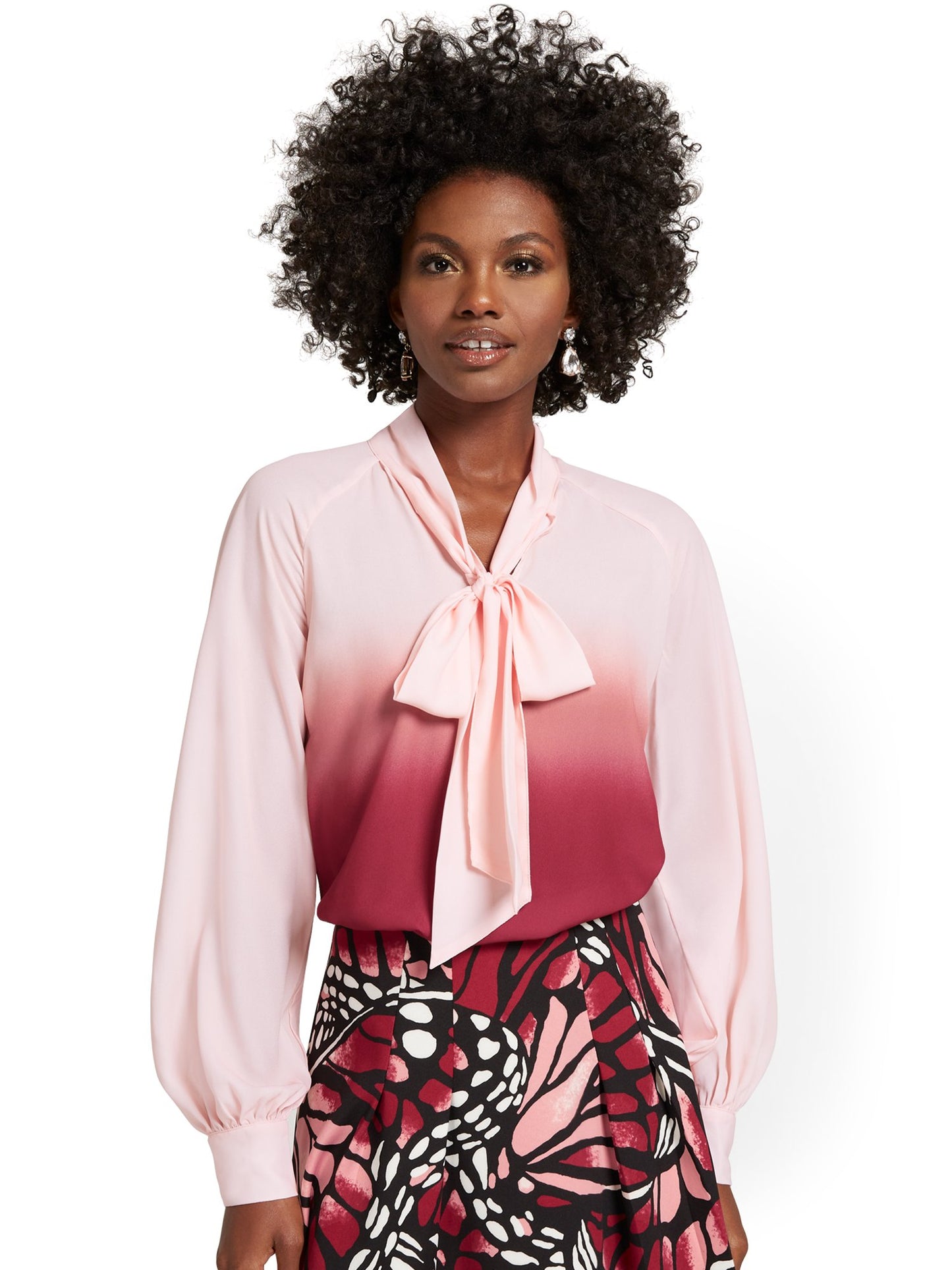 An ombre print gives this blouse a trendy twist, while its self-tie neck bow exudes elegance.