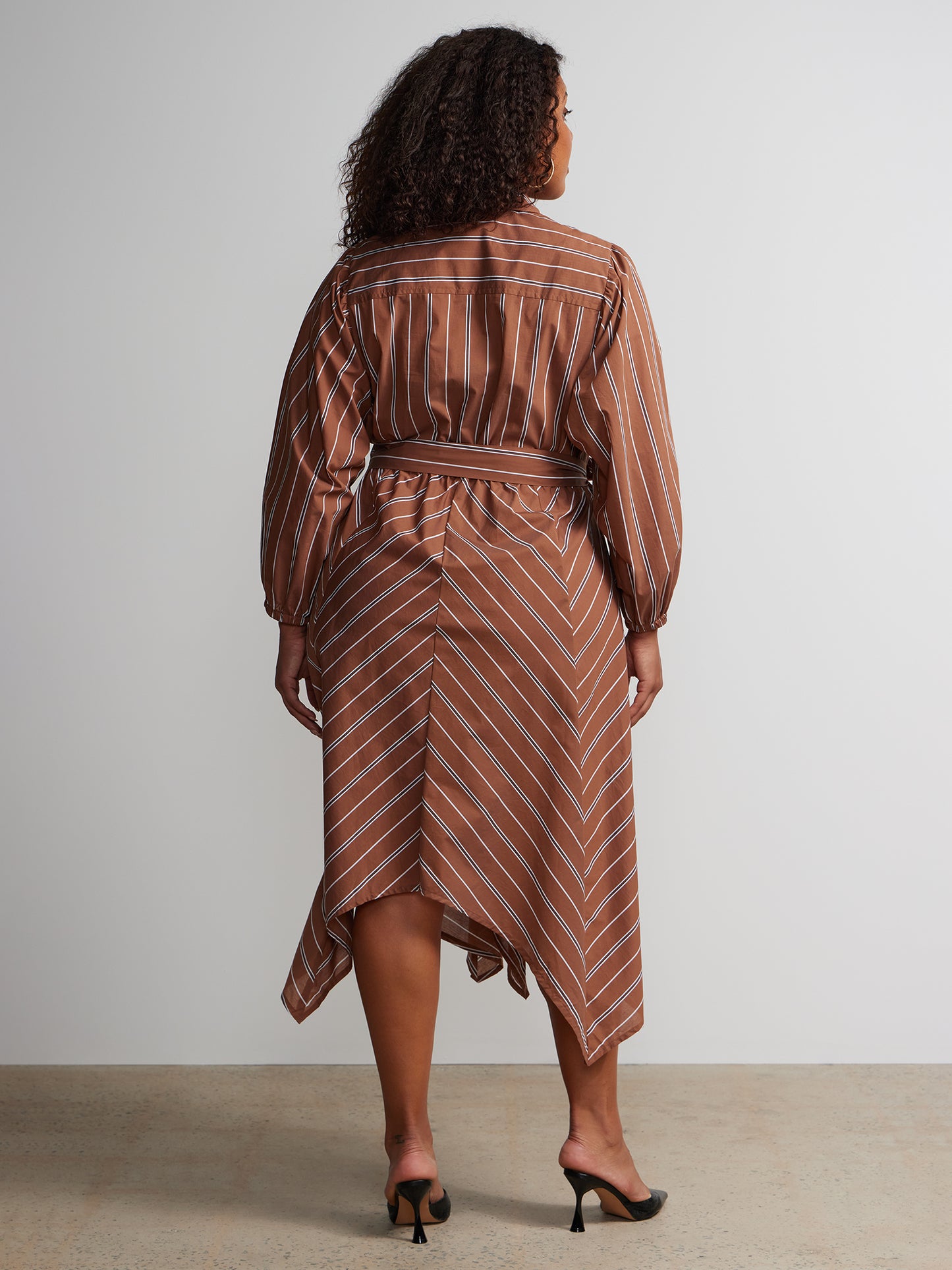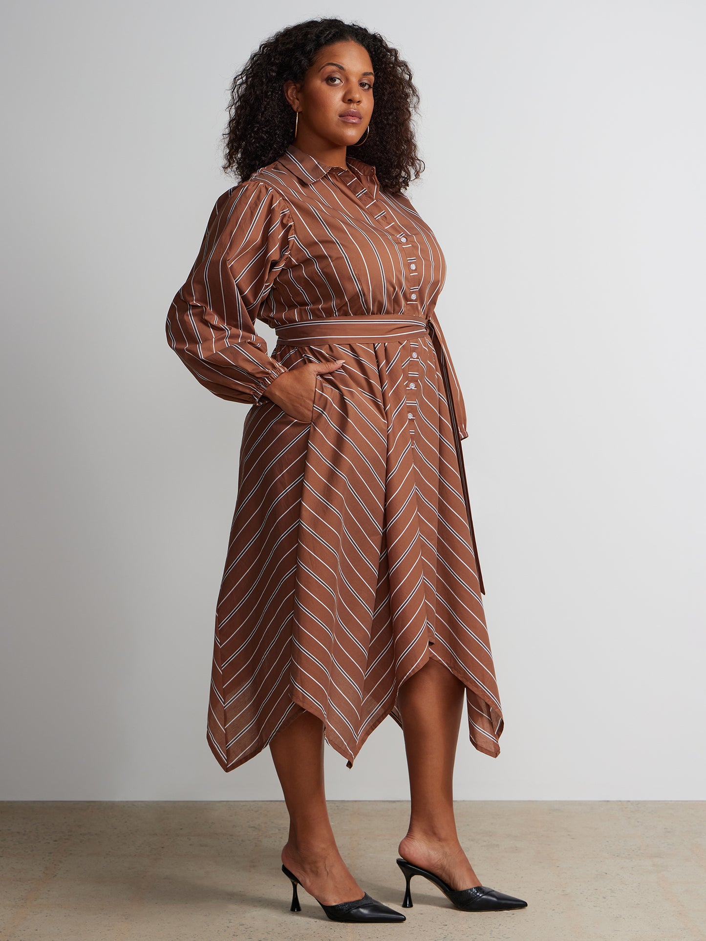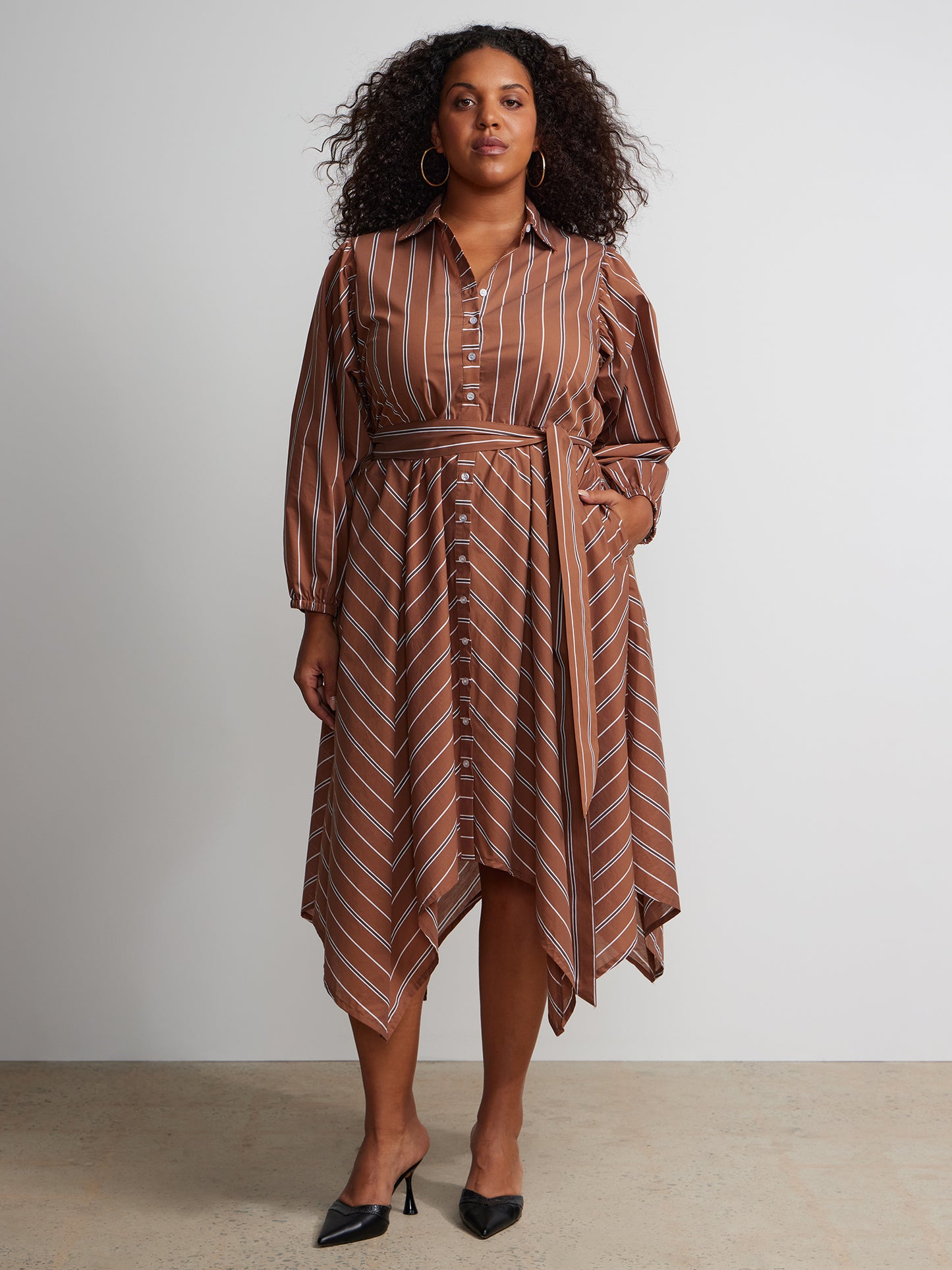 Stylish and comfortable, this chic shirt dress will be your go-to outfit for work or brunch. With its collared neckline, long sleeves, and tie-waist, this dress effortlessly combines comfort and sophistication. The hanky hem and stripes add a playful twist, making it an absolute closet must-have. Style it with your favorite heels to complete the look.