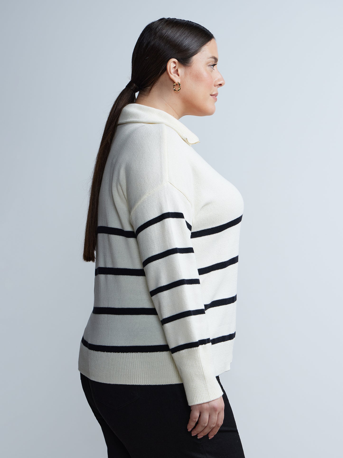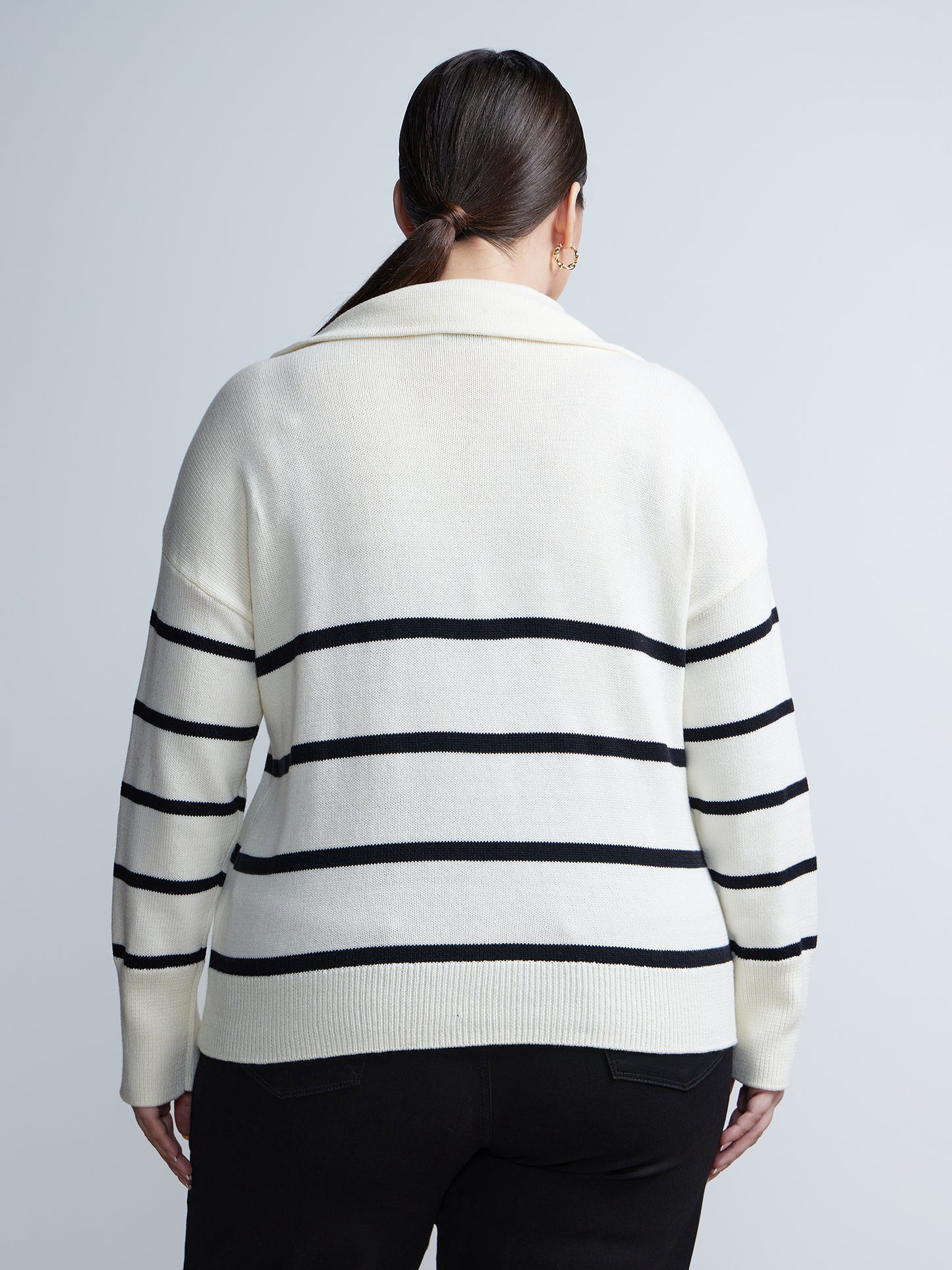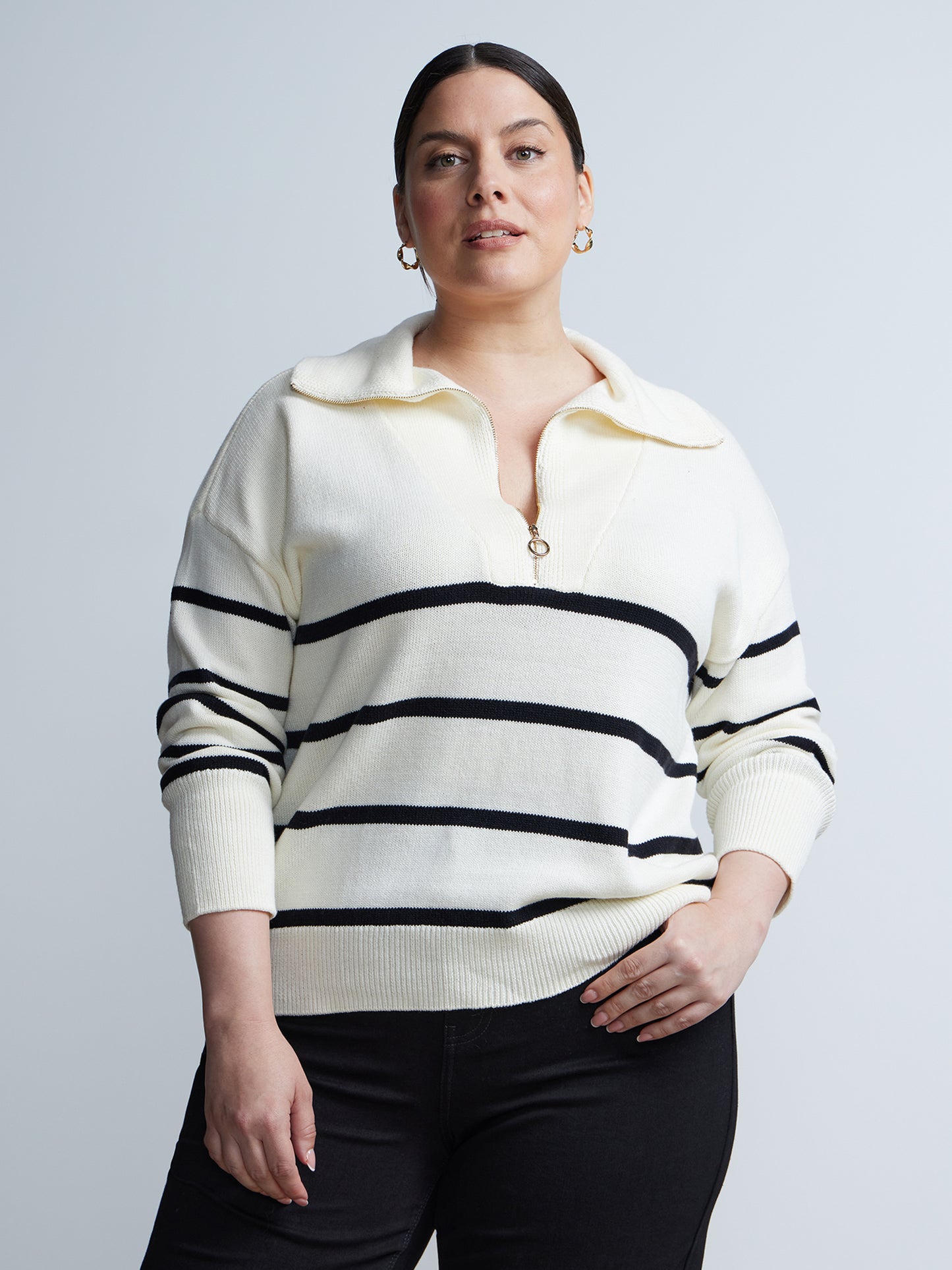 Embrace fashion that envelops you in both comfort and chic appeal with this timeless piece. This sweater boasts a zip-up collar that radiates sophistication, enhanced by a striped pattern. The ribbed trim lends depth.