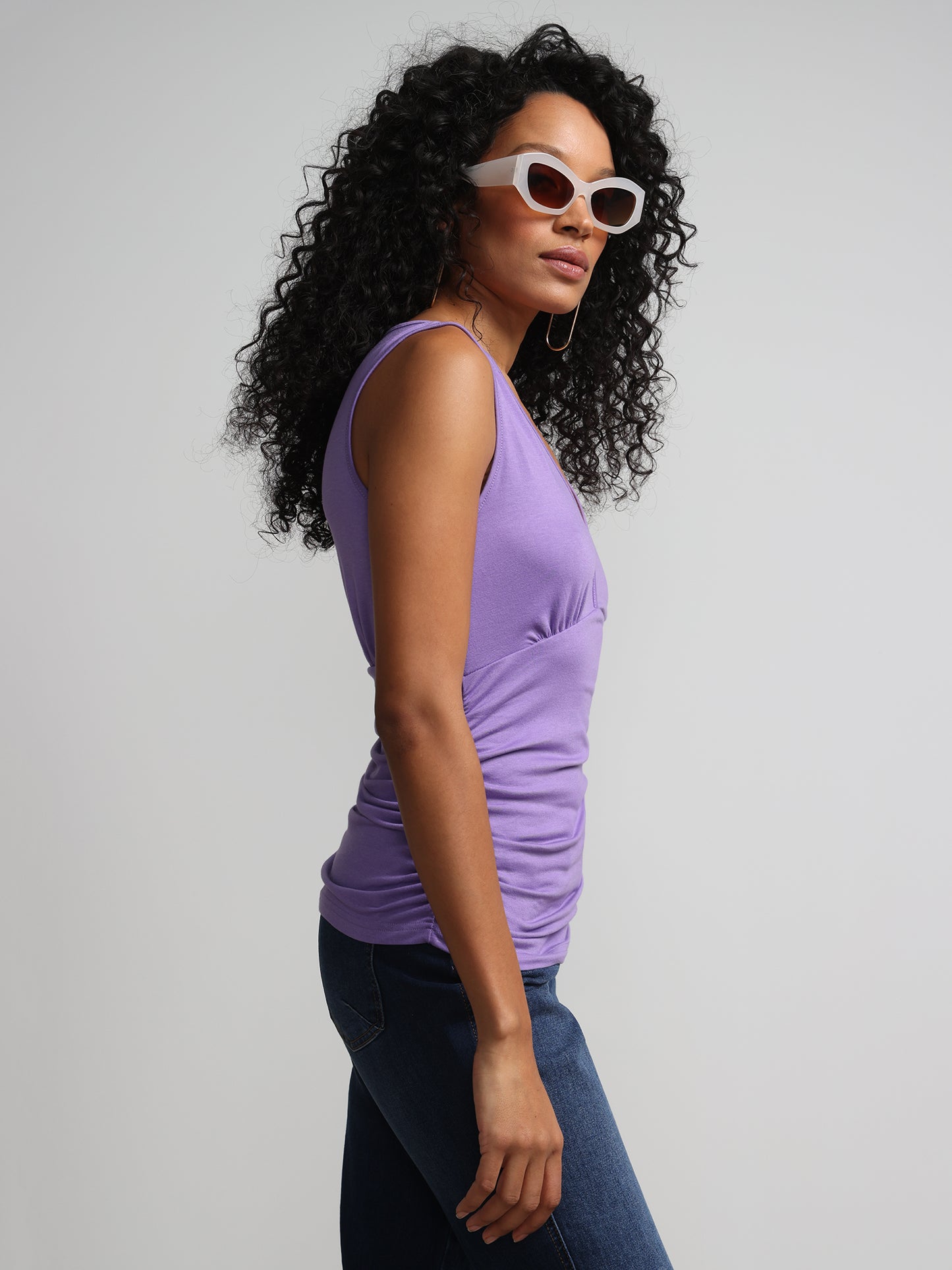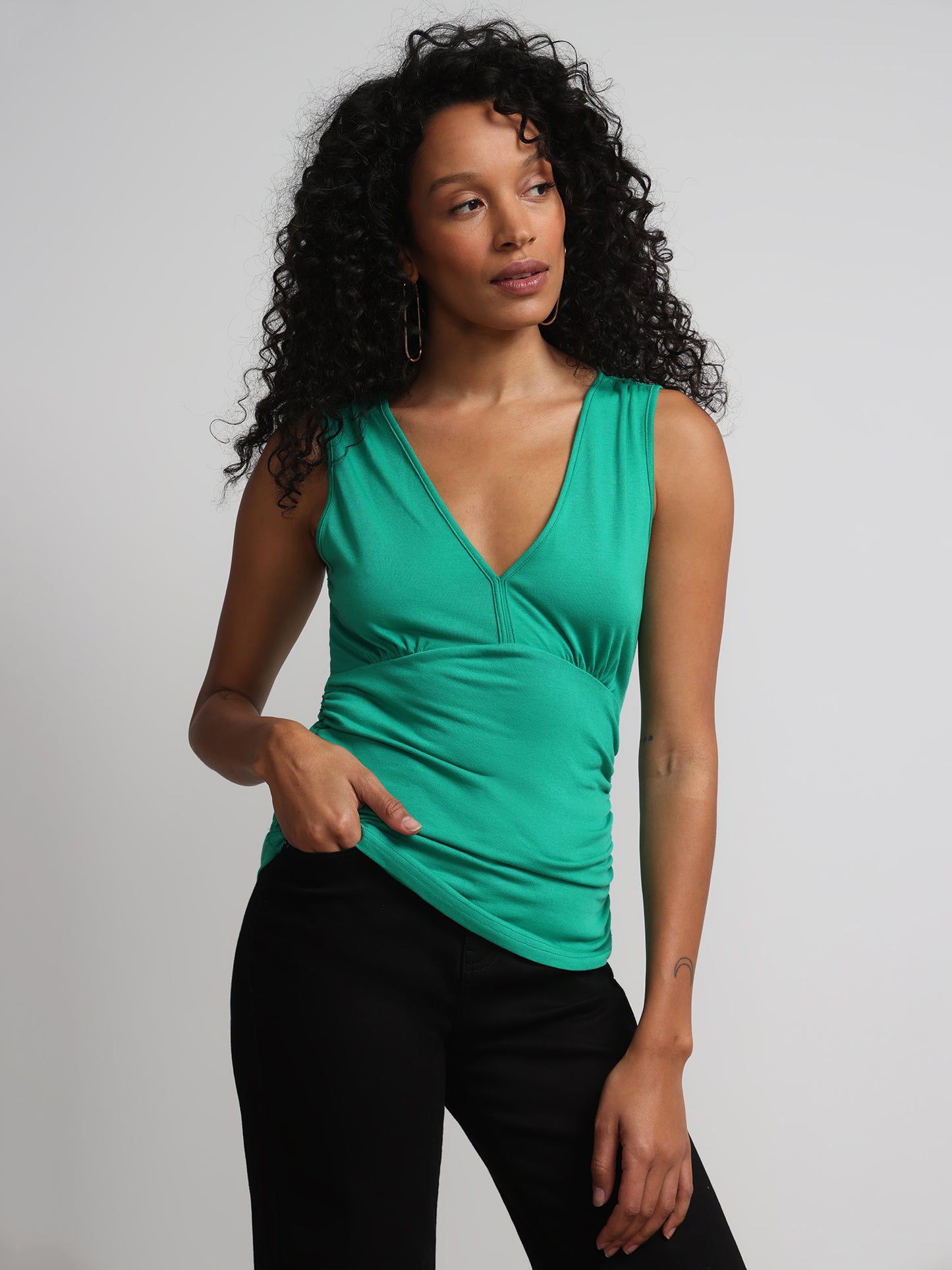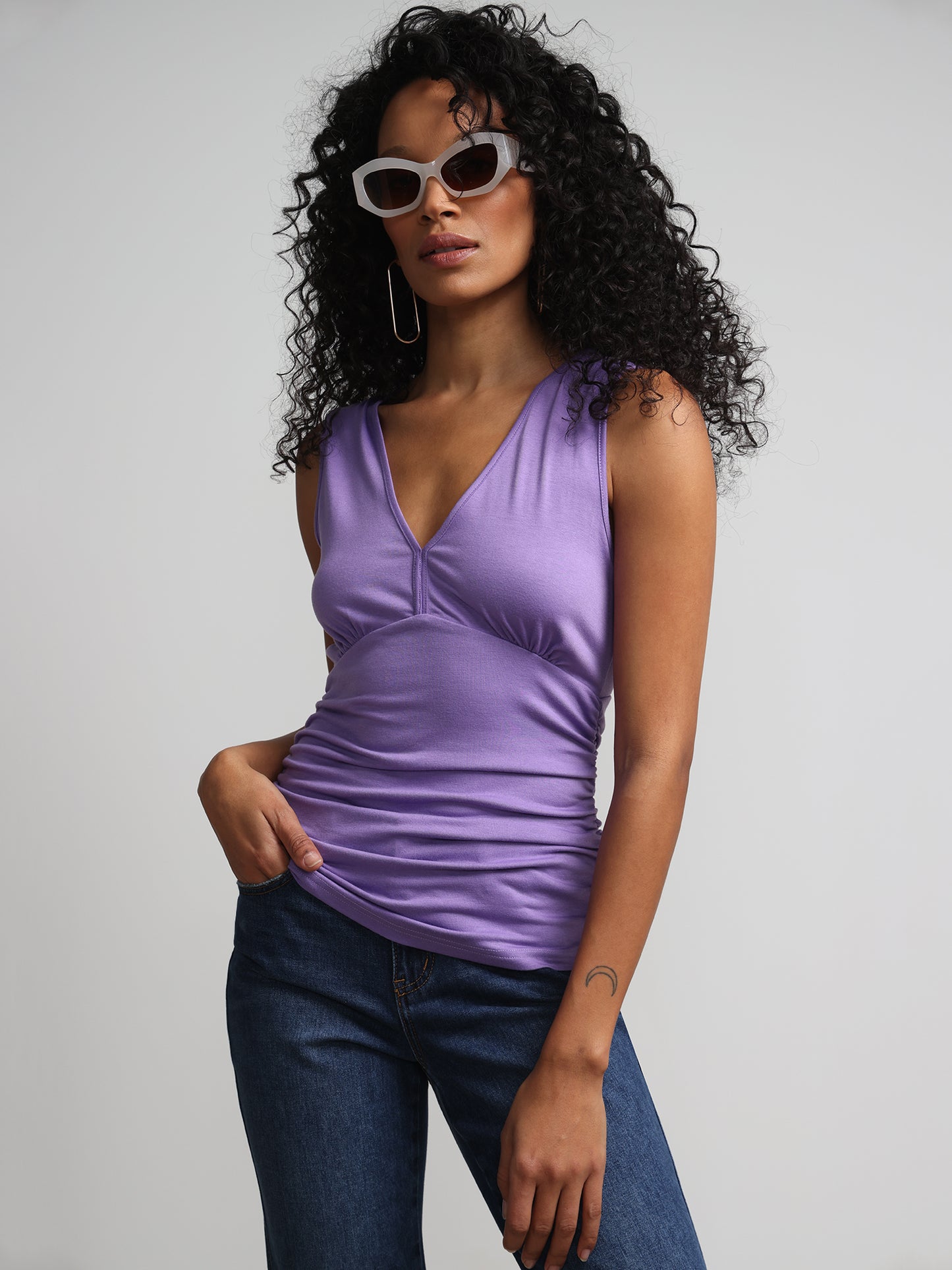 With a plunging V-neck and ruched texture, this sleeveless top is both versatile and flattering.
