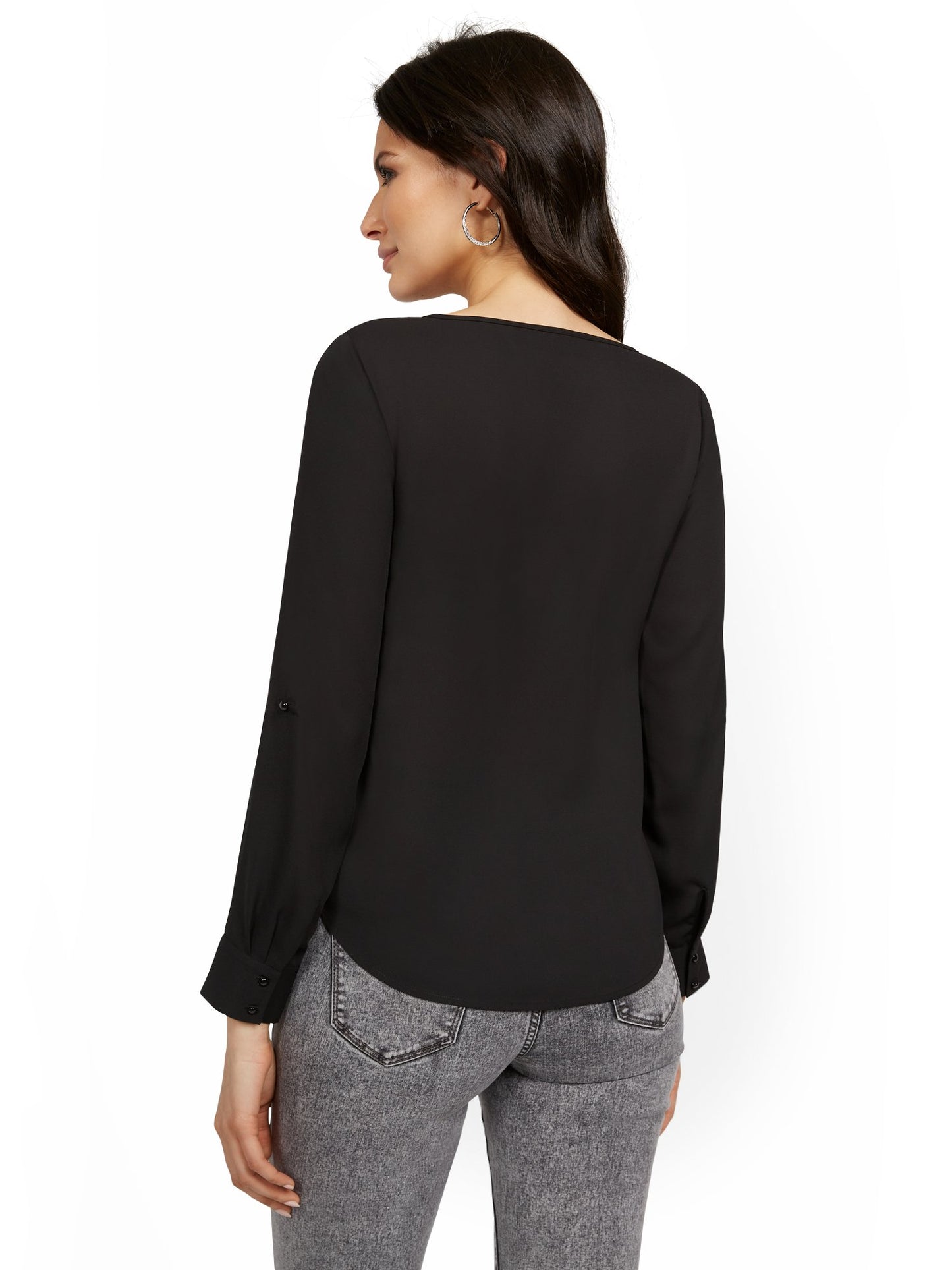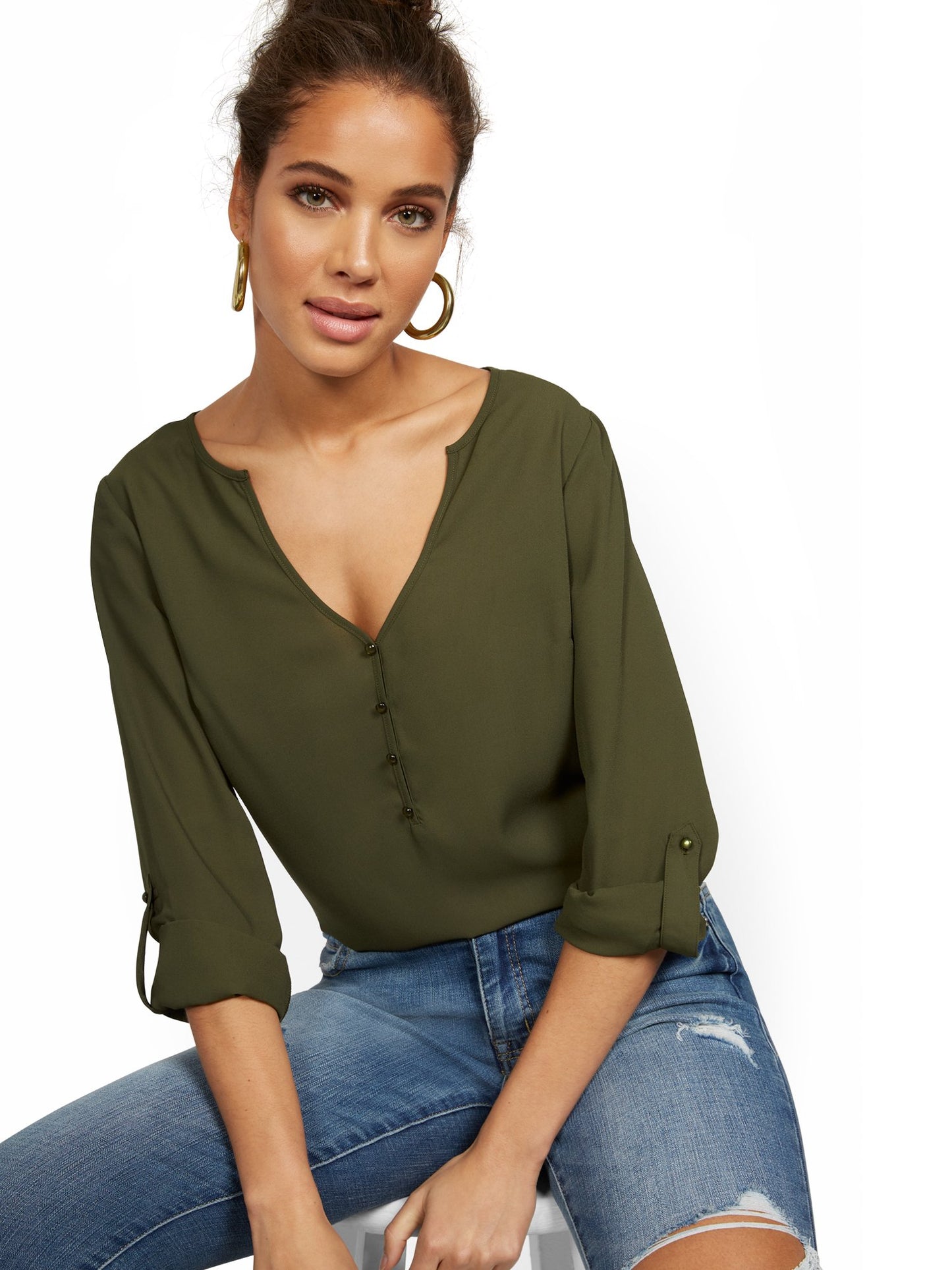 Easy and basic, this button-front blouse with a V-like neckline is the ideal throw-on-and-go option. With comfy tab sleeves, just tuck into jeans, add a gold necklace, and greet the day.
